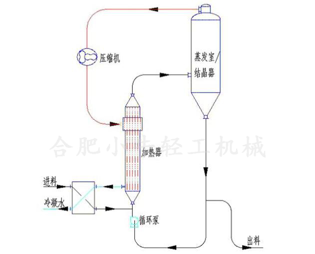 物料在加熱器的管程內(nèi)被殼程的蒸汽加熱溫度升高,在循環(huán)泵作用下物料上升到分離器中,在分離器內(nèi)由于物料靜壓下降使物料發(fā)生蒸發(fā)。蒸發(fā)產(chǎn)生二次蒸汽從物料中溢出,物料被濃縮產(chǎn)生過飽和而使結(jié)晶生長,解除過飽和的物料進入強制循環(huán)泵,在循環(huán)泵作用下進入加熱器,物料如此循環(huán)不斷蒸發(fā)濃縮或濃縮結(jié)晶。晶漿從循環(huán)管路中用出料泵輸出。蒸發(fā)分離器內(nèi)的二次蒸汽經(jīng)過蒸發(fā)分離器上部的分離和除沫裝置凈化后輸送到壓縮機,壓縮機把二次蒸汽壓縮后輸送到加熱器殼程用作蒸發(fā)器加熱蒸汽,實現(xiàn)熱能循環(huán)連續(xù)蒸發(fā)。